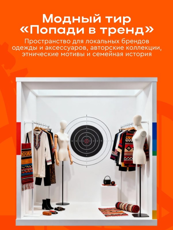 👗 Модный тир «Попади в тренд»: пространство для локальных брендов одежды и аксессуаров, авторские коллекции, этнические мотивы и семейная история.