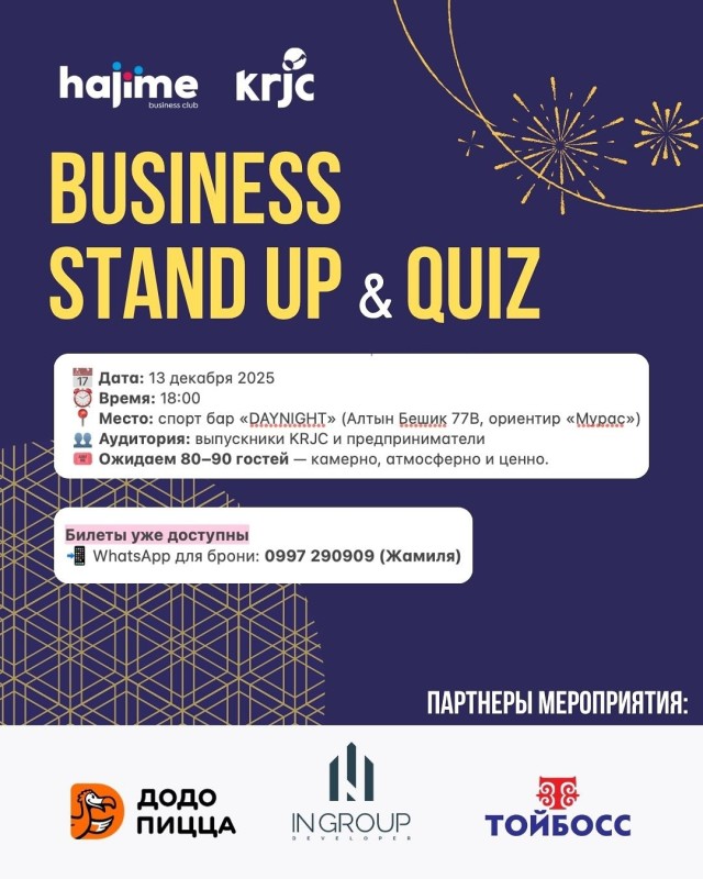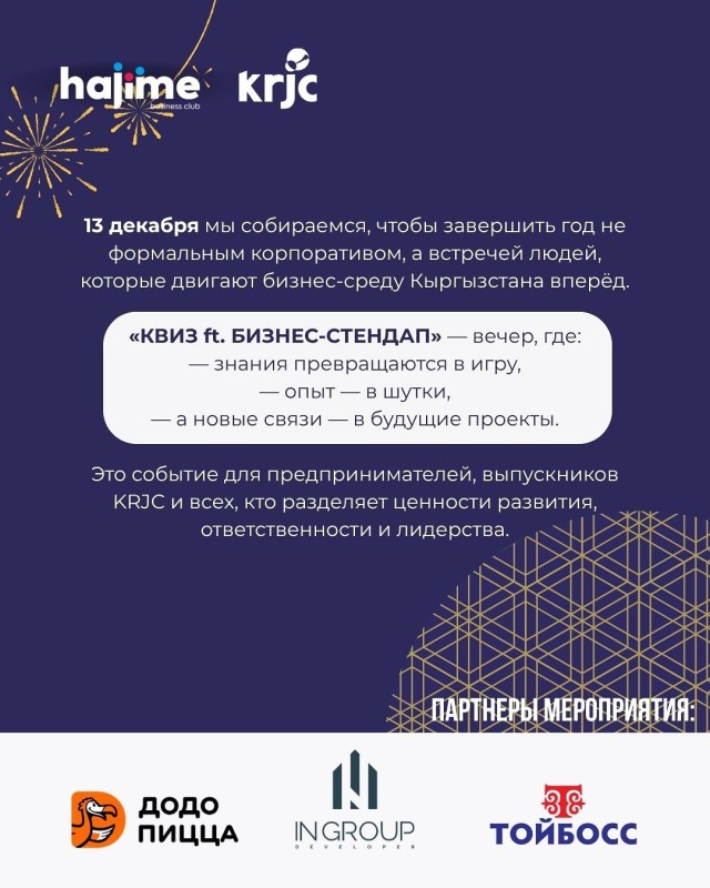 13 декабря мы собираем предпринимателей, выпускников KRJC и всех, кто хочет завершить год ярко — в компании людей, которые вдохновляют.