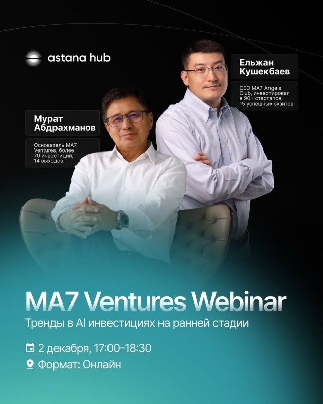 🚀 MA7 Ventures сізді Мұрат Абдрахмановпен (MA7 Ventures негізін қалаушы, 70-тен астам инвестиция, 14 exit) және Елжан Күшекбаевтың (MA7 Angels Club CEO, 90+ стартапқа инвестициялаған, 15 табысты exit) қатысуымен өтетін вебинарға шақырады.