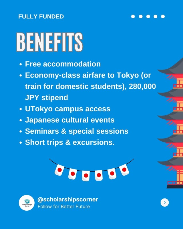 Benefits: Free accommodation, Economy-class airfare to Tokyo (or train for domestic students), 280,000 JPY stipend, UTokyo campus access, Japanese cultural events, Seminars & special sessions, Short trips & excursions.