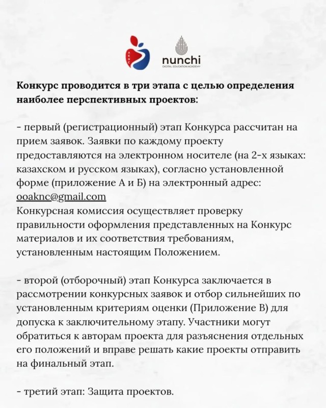 - первый (регистрационный) этап Конкурса рассчитан на прием заявок. Заявки по каждому проекту предоставляются на электронном носителе (на 2-х языках: казахском и русском языках), согласно установленной форме (приложение А и Б) на электронный адрес: ooaknc@gmail.com