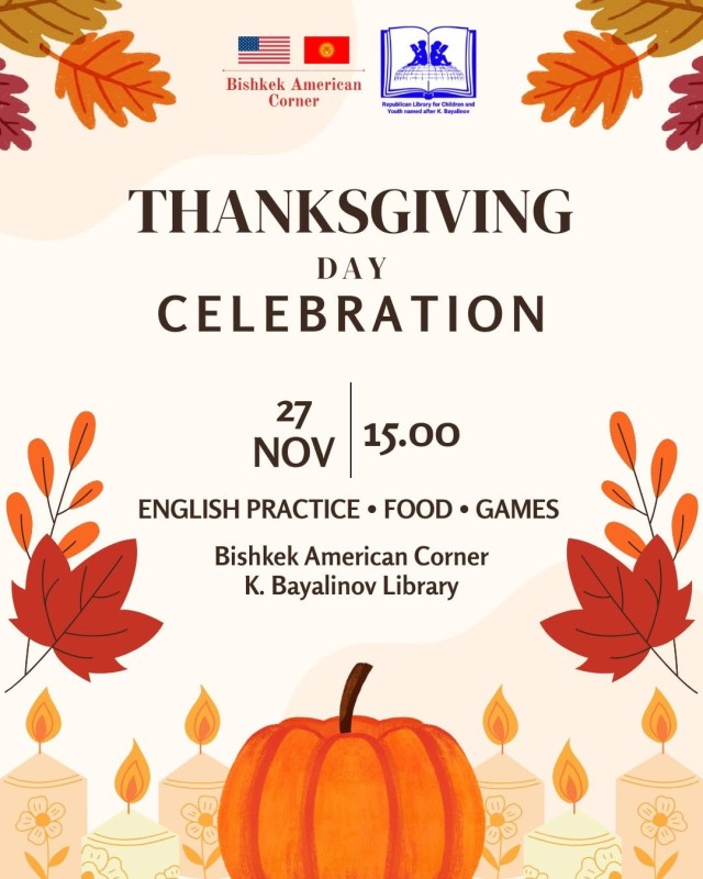 Присоединяйтесь к нам в Американском уголке в Бишкеке 27 ноября с 15:00 до 17:00 на праздничном вечере! Приносите с собой угощение — тыквенные пироги особенно приветствуются! 🥧