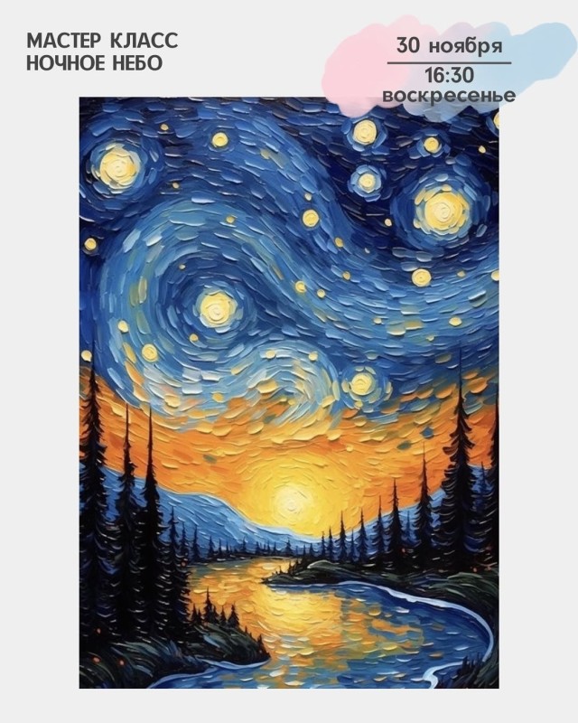На мастер-классе «Звездное небо» ты создашь картину с атмосферой горной тишины и бесконечного звездного неба. Без спешки, в уютной обстановке - просто наслаждаясь процессом творчества.