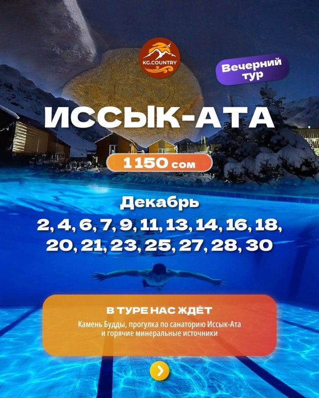 ВЕЧЕРНЯЯ ИССЫК-АТА - прогулка по санаторию, купание в горячих минеральных источниках, монумент "камень Будды". Релакс тур для всех!