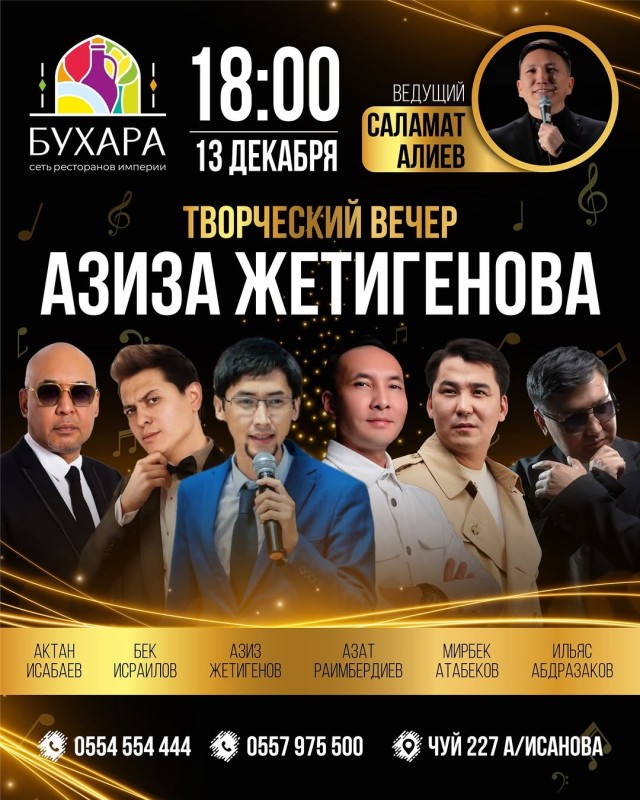 Вас ждёт живое выступление талантливого и любимого многими исполнителя — Азиза Жетигенова, чьи песни трогают сердце с первых нот.