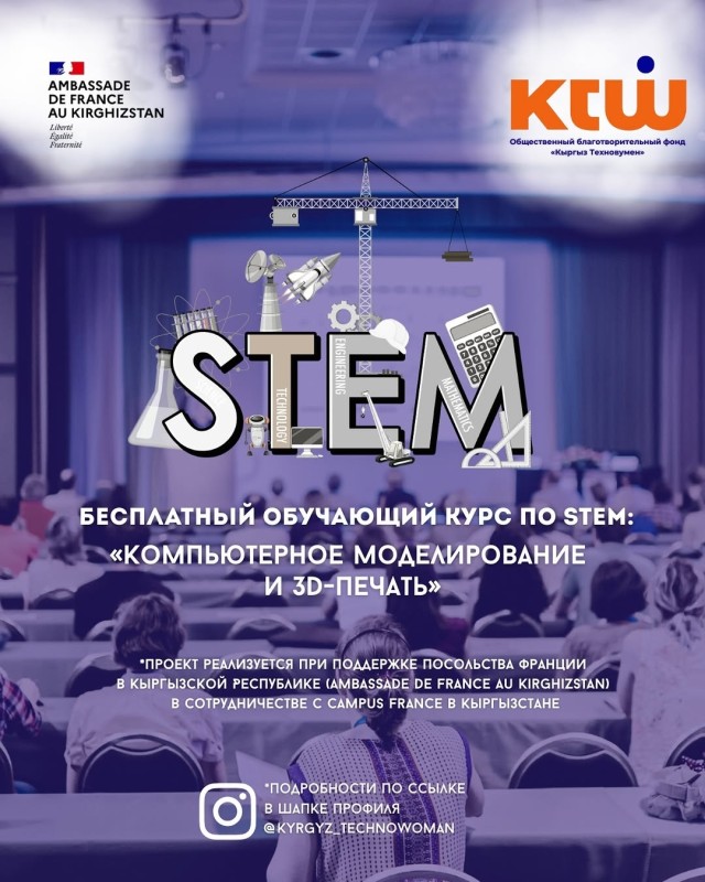 В Бишкеке начинается реализация нового обучающего курса по STEM-направлению «Компьютерное моделирование и 3D-печать», который проводится Общественным фондом «Кыргыз Техновумен» при поддержке Посольства Франции в Кыргызской Республике и Campus France в Кыргызстане. Программа направлена на расширение участия женщин в технологическом секторе и повышение их цифровой компетентности.