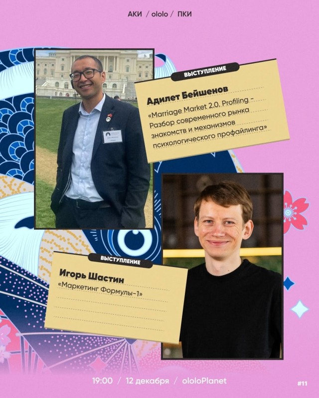 🔹 Адилет Бейшенов @adiletbeishenov — аналитик, исследователь, разработчик продуктов. Раскроет тему «Marriage Market 2.0. Profiling» и разберёт, как устроен современный рынок знакомств и какие механизмы психологического профайлинга стоят за тем, как мы выбираем друг друга.
