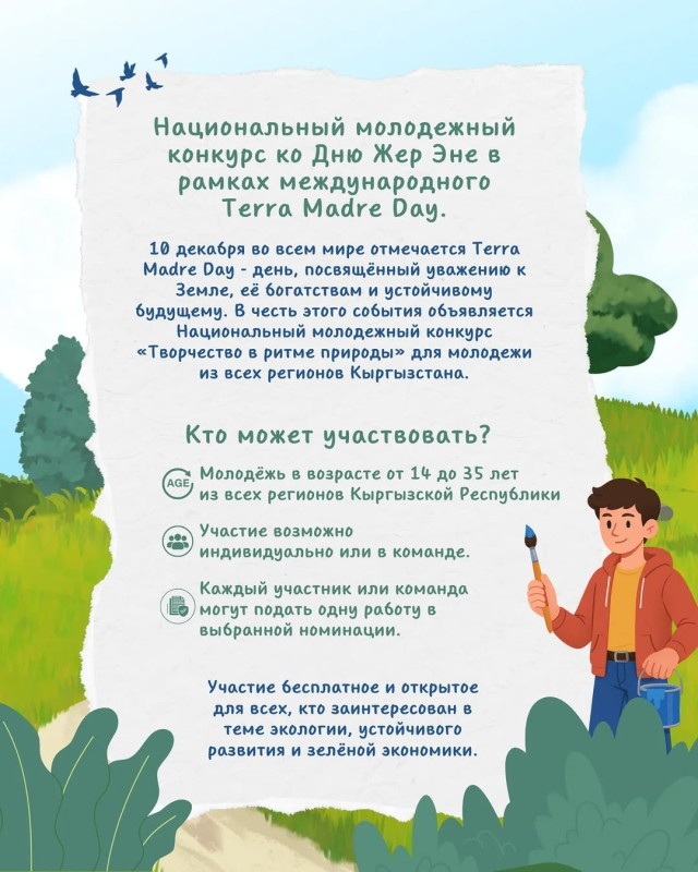 10 декабря во всем мире отмечается Terra Madre Day - день, посвящённый уважению к Земле, её богатствам и устойчивому будущему. В честь этого события объявляется Национальный молодежный конкурс «Творчество в ритме природы» для молодежи из всех регионов Кыргызстана.
