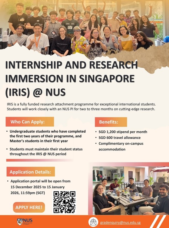 Applications for IRIS@NUS are now open! Connect with like-minded peers, gain hands-on research experience, and discover what NUS has to offer. Choose between two cohort periods: May–July 2026 or August–September 2026. Limited spots available – apply by 15 January 2026.