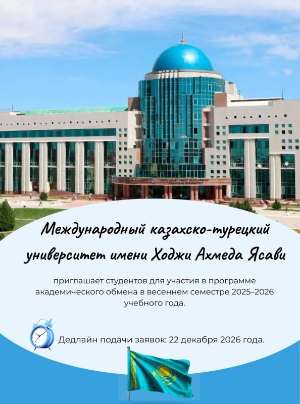 Ошский государственный университет объявляет набор заявок для участия в программе академического обмена и обучения в Международном казахско‑турецком университете имени Ходжи Ахмета Ясави (AYU, Туркестан, Казахстан) — международном вузе с широким спектром факультетов и образовательных программ.