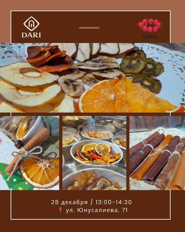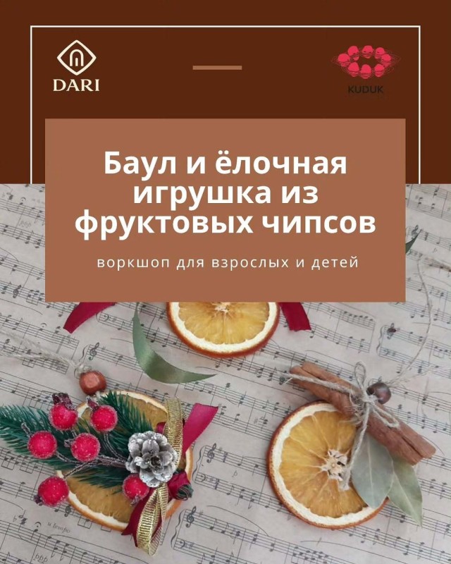 Воркшоп для взрослых и детей: баул и ёлочная игрушка из фруктовых чипсов
