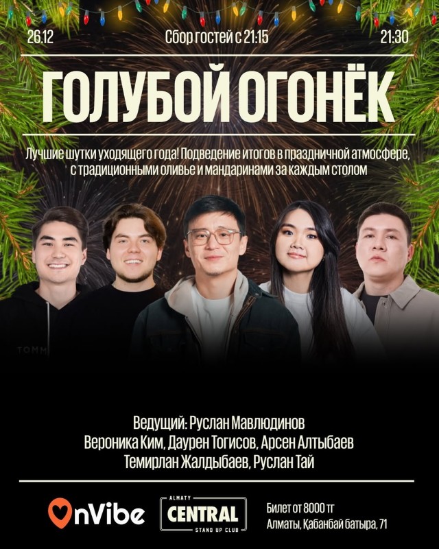 Пять дней подряд провожаем старый год в сопровождении лучшей стендап-комедии Казахстана!Лучшие шутки уходящего года! Подведение итогов в праздничной атмосфере, с традиционными оливье и мандаринами за каждым столом 🎄