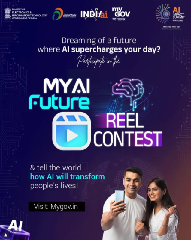 Create a fun, 30–60 second reel sharing your vision of a future with AI. Post it on Instagram Reels, YouTube Shorts, or Facebook, tag @goi_meity @mygovindia @officialindiaai, use #MeraAIFuture, and keep it public so we can see and celebrate your idea!