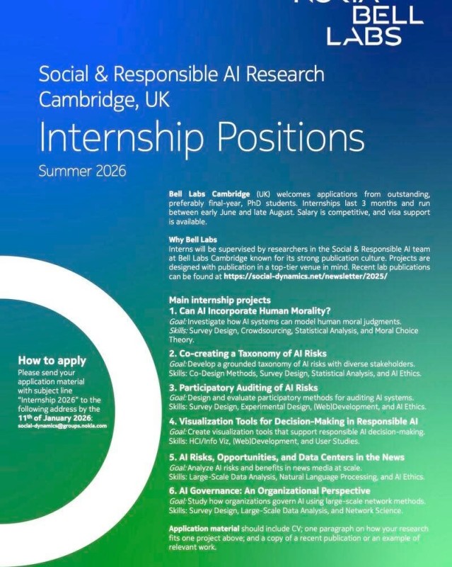 🚀 Advance Your Research with a Paid Social & Responsible AI Internship at Bell Labs Cambridge – Summer 2026! 🚀