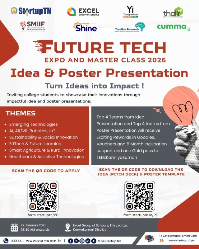 StartupTN and Excel Group of Schools, in association with Young Indians – Kanniyakumari, SMIIF, and Aakam Shine, present Future Tech Expo & Master Class 2026 – Idea & Poster Presentation, inviting college students to showcase breakthrough ideas and future technologies.