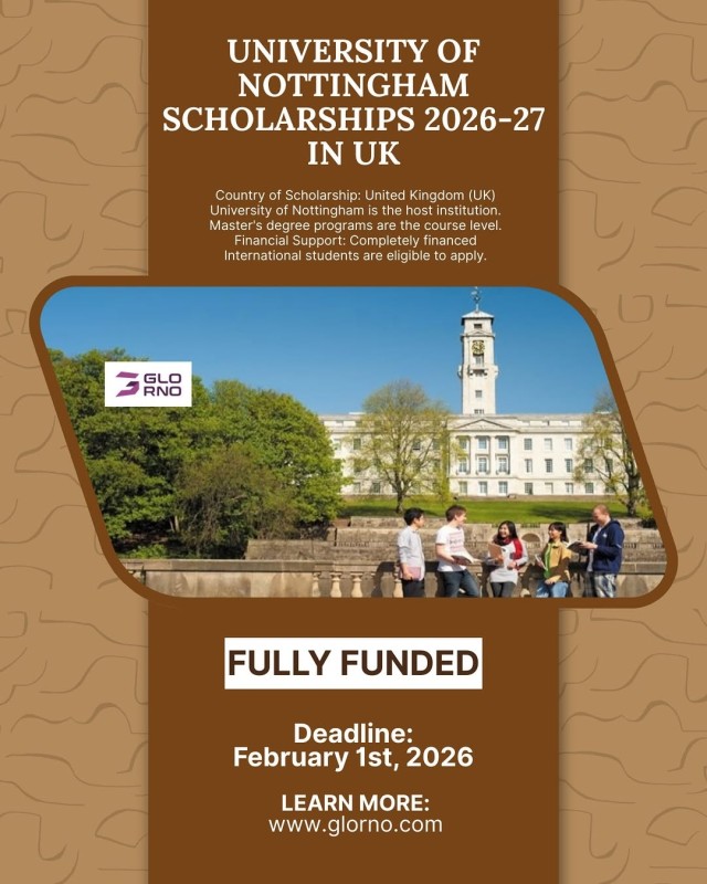 The @uniofnottingham is offering fully funded scholarship opportunities for international students enrolling in undergraduate, master’s, and PhD programs for the 2026-2027 academic year.