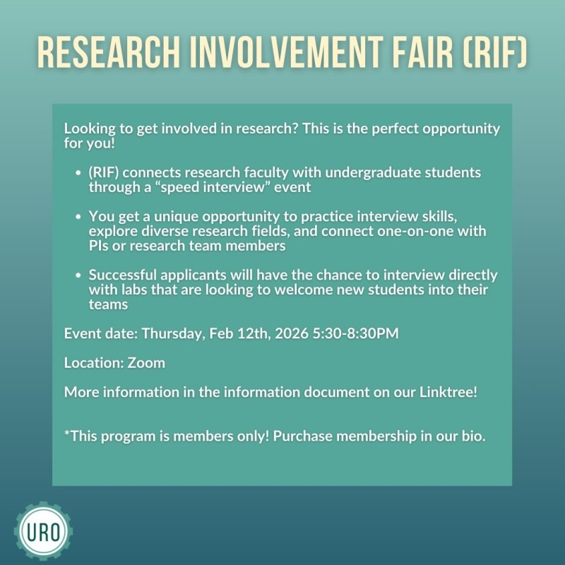 URO’s Research Involvement Fair (RIF) connects research faculty with undergraduate students through a “speed interview” event. Undergrads get a unique opportunity to practice their interview skills, explore diverse research fields, and connect one-on-one with Principal Investigators or research team members. Successful applicants will have the chance to interview directly with labs that are looking to welcome new students into their teams.