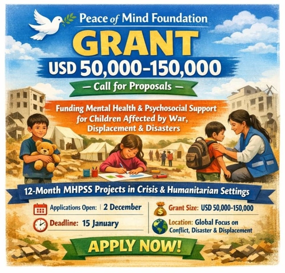 Apply for USD 50,000–150,000 grants to deliver child-focused Mental Health and Psychosocial Support (MHPSS) projects for children affected by conflict, displacement, violence, or natural disasters in humanitarian and crisis settings worldwide.