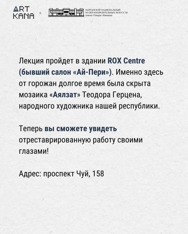 Лекция ROX Centre имаратында өтөт (мурдагы «Ай-Пери» салону). Дал ушул жерде көп жылдар бою шаар тургундарынан жашырылып келген, өлкөбүздүн эл сүрөтчүсү Теодор Герцендин «Аялзат» мозаикасы жайгашкан. Реставрацияланган чыгарманы өз көзүңүз менен көрө аласыз!