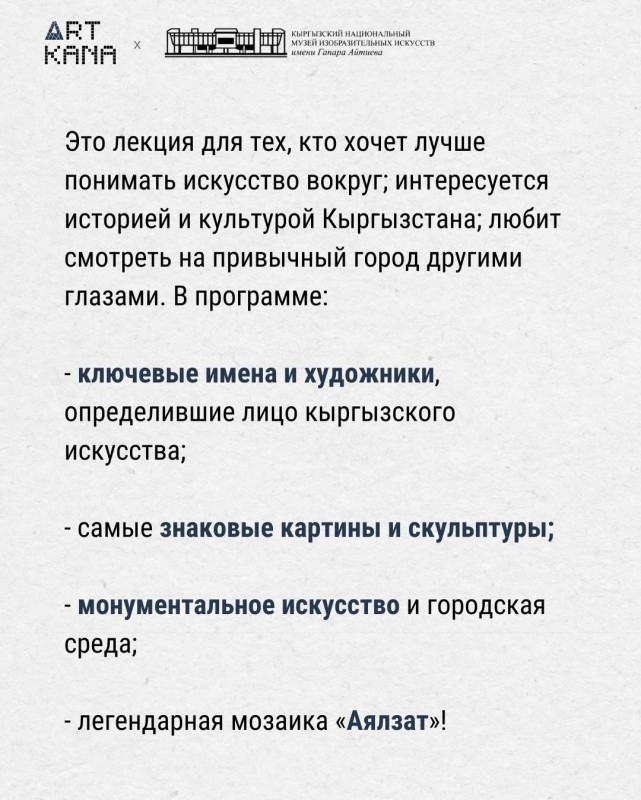 Лекция искусство тарыхы боюнча музейдиги курстун алкагында өткөрүлөт.