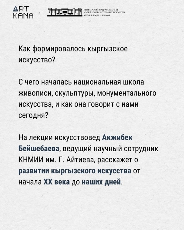 Өнөр таануучу, Г. Айтиев атындагы Кыргыз улуттук көркөм сүрөт искусство музейинин жетектөөчү илимий кызматкери Акжибек Бейшебаева XX кылымдын башынан бүгүнкү күнгө чейинки кыргыз искусствосунун өнүгүү жолу тууралуу лекция окуйт.