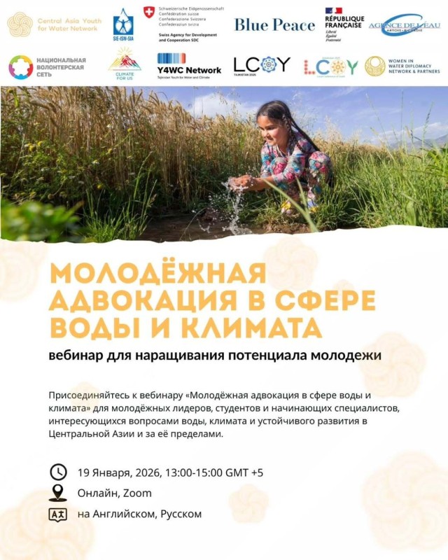 Данный вебинар создаёт образовательное пространство для молодёжи, где участники смогут глубже разобраться в вопросах воды и климата и понять, как молодёжь может вносить вклад в конструктивное, основанное на фактах взаимодействие на местном, национальном и региональном уровнях.