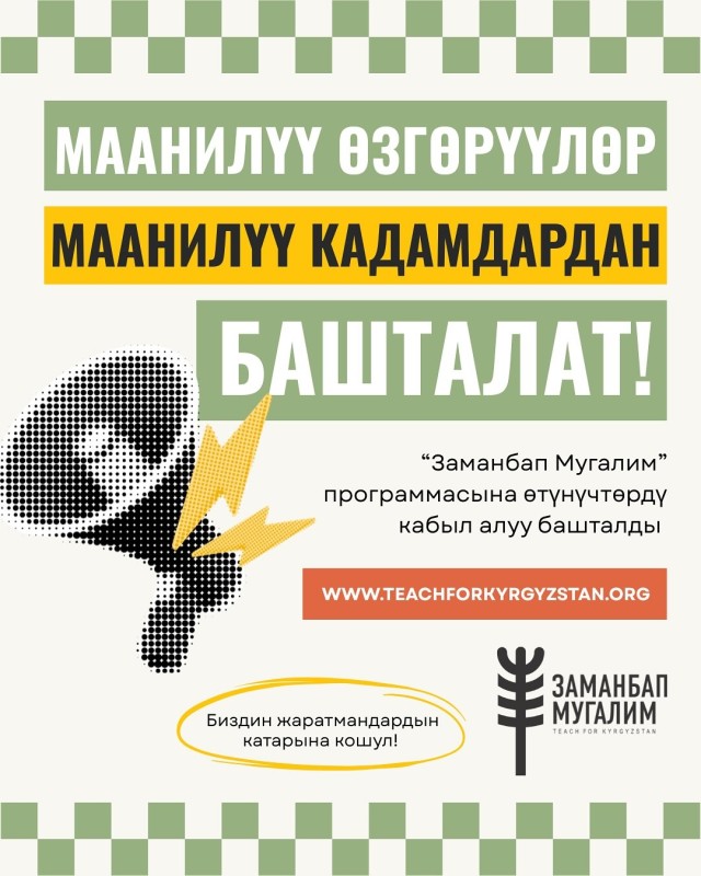 🏫 Кыргызстандын ар бир аймагындагы балдар шыктандырып, чоң кыялдарга жетелеген, мотивациялуу жана таланттуу мугалим-жаратмандарга муктаж.