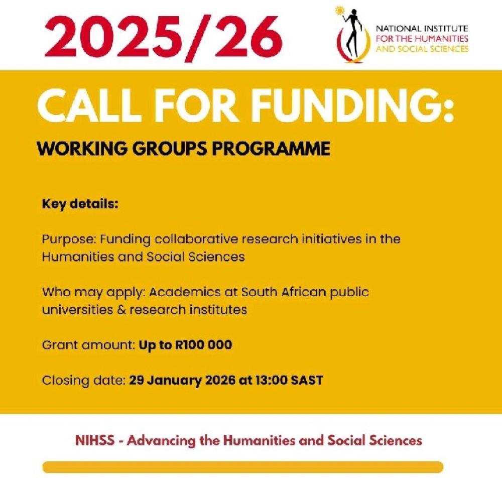 The NIHSS Working Group Programme 2025–2026 is now open! This funding supports collaborative research teams in the humanities and social sciences, helping scholars publish, network, and strengthen African-centred research.