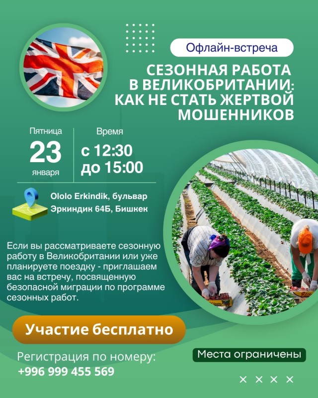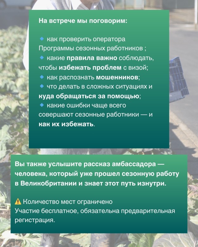 Если вы рассматриваете сезонную работу в Великобритании или уже планируете поездку - приглашаем вас на встречу, посвященную безопасной миграции по Программе сезонных работников в Великобританию.