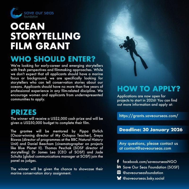 The Save Our Seas Foundation Grants fund impactful projects focused on sharks, rays & threatened marine species, supporting research, conservation, education, and ocean storytelling. Grants include Keystone & Small Grants, Conservation Fellowships, and Storytelling Photography and Film Grants — with opportunities open worldwide!
