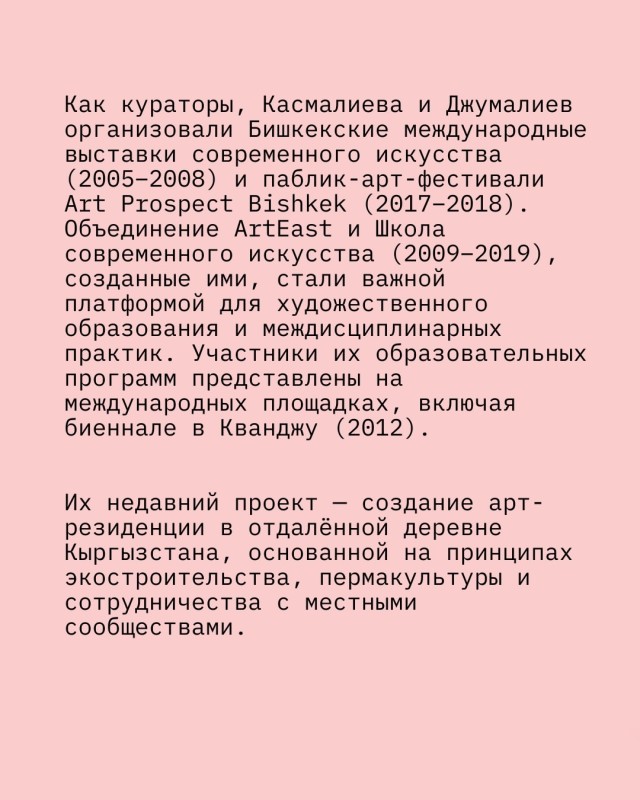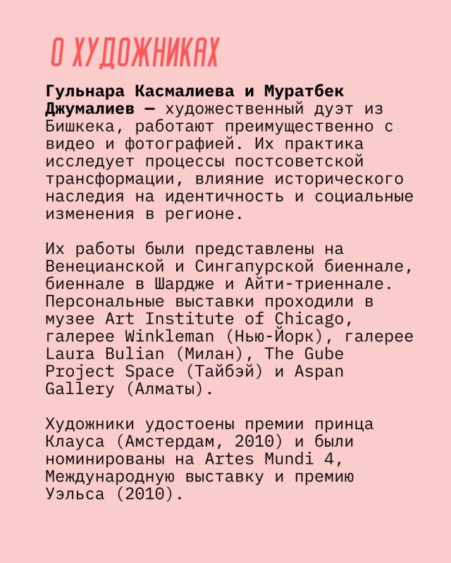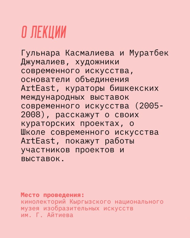 В рамках проекта «Мобильная библиотека: Кыргызстан» Гульнара Касмалиева и Муратбек Джумалиев — художники современного искусства и основатели объединения ArtEast — расскажут о своих кураторских проектах 2000-х годов, о Бишкекских международных выставках современного искусства (2005–2008), о Школе современного искусства ArtEast, а также покажут работы участников проектов и архивные материалы.
