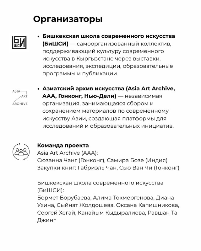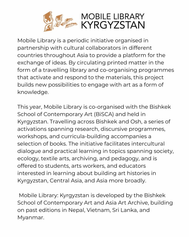 «Мобильная библиотека: Кыргызстан» реализуется Бишкекской школой современного искусства (BiSCA) в партнёрстве с Asian Art Archive @asiaartarchive (Гонконг).