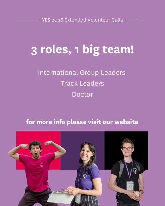 The Volunteer Calls for the YES 2026 are now extended for International Group Leaders (IGLs)🩷🫂 Track Leaders💜🗣️ and Doctor🖤🩺