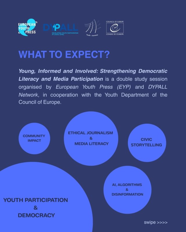 Join a European study session we organise on 𝗺𝗲𝗱𝗶𝗮, 𝗱𝗲𝗺𝗼𝗰𝗿𝗮𝗰𝘆 & 𝘆𝗼𝘂𝘁𝗵 𝗽𝗼𝘄𝗲𝗿. Your voice belongs in the room!