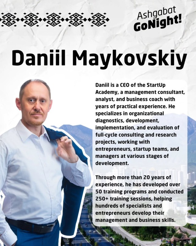 📍 Where: “Ish Nokady” coworking center, 2nd floor, Arkach Business Center, Magtymguly Avenue