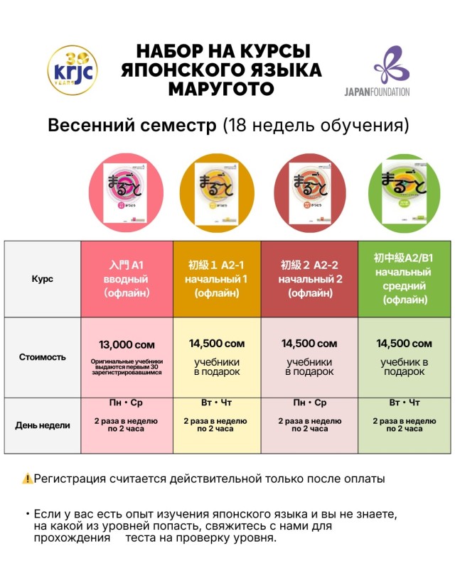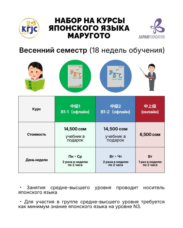 Кыргыз-Япон адам ресурстарын өнүктүрүү борбору япон тилинин «Маругото» курстары боюнча жазгы семестрге кабыл алууну жарыялайт!