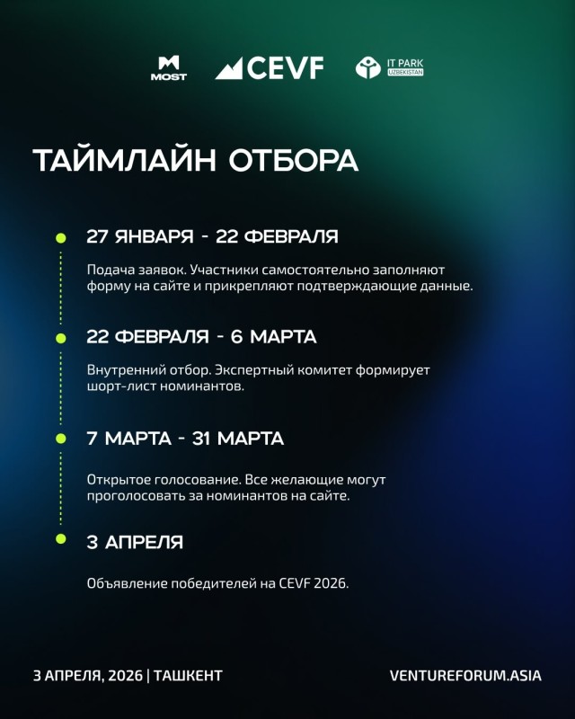 После рассмотрения заявок организационным комитетом откроется голосование среди участников, а победители будут награждены 3 апреля в конце Central Eurasian Venture Forum 2026 в Ташкенте.