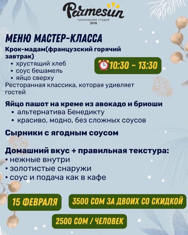 Кулинарный мастер-класс: крок-мадам, яйцо пашот и сырники | Бишкек 15.02.2026