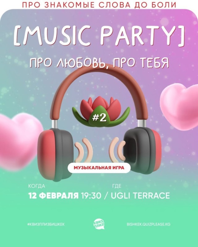 What is love? Ответим на этот вопрос все вместе на самой романтичной [music party]. Вас ждут целых 8 раундов с треками про любовь, ну мёд, не иначе. А ещё эта игра — прекрасный вариант для первого свидания. И второго, и третьего... А можно и не для свидания, вы, главное, приходите. Вдруг ваша судьба поджидает вас именно на Квиз, плиз!? В общем, в любом случае регайтесь, а там разберётесь.