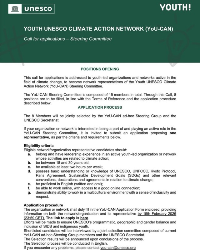 Are you part of a youth-led climate organization or network? The UNESCO Youth Climate Action Network (YoU-CAN) is recruiting 8 Steering Committee members to shape global youth climate action.