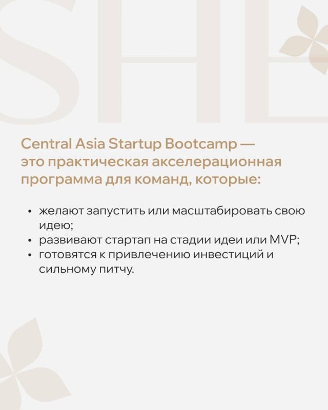 Bootcamp — однодневный офлайн-интенсив для стартап-команд из стран Центральной Азии, ориентированный на запуск, развитие и подготовку проектов к инвестициям.