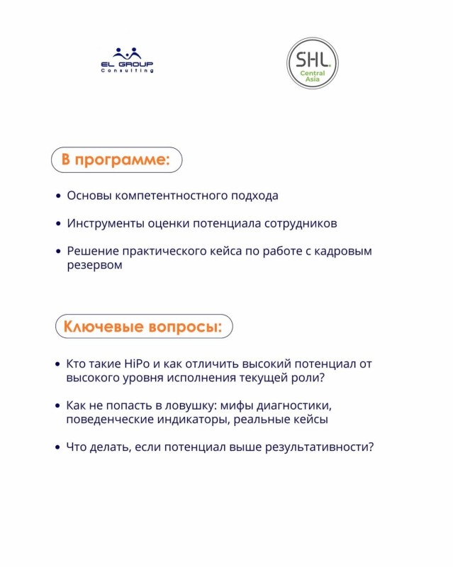 эксперты SHL Central Asia в сотрудничестве с El Group Consulting приглашают вас на трёхчасовой интерактивный практикум, посвящённый выявлению и развитию будущих лидеров и формированию кадрового резерва.