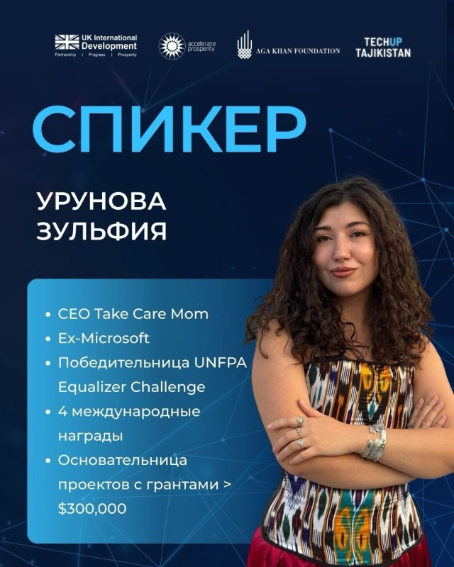 Урунова Зулфия - CEO @takecare_mom , ex-Microsoft, победительницей UNFPA Equalizer Challenge, обладательницей 4 международных наград и фаундером, привлекшим более $300.000 грантов на свои проекты.