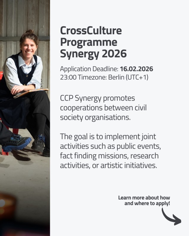 💡 У вас есть вдохновляющая идея для сотрудничества в тематических сферах политики и общества, медиа и культуры, прав человека и мира или устойчивого развития и климатической справедливости? Тогда подавайте заявку совместно с партнёрской организацией на участие в программе CCP Synergy, которая поддержит ваше сотрудничество!