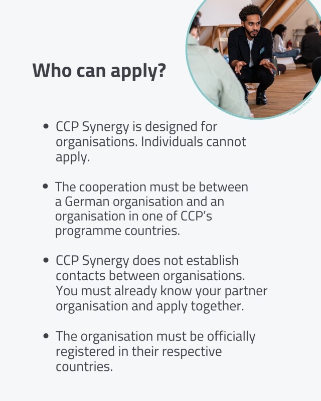 💡 Сизде саясат жана коом, медиа жана маданият, адам укуктары жана тынчтык же туруктуу өнүгүү жана климаттык адилеттүүлүк жаатында кызматташуу үчүн кызыктуу идея барбы? Анда өнөктөш уюмуңуз менен CCP Synergy программасына кызматташууңузду каржылатуу үчүн арыз бериңиз!