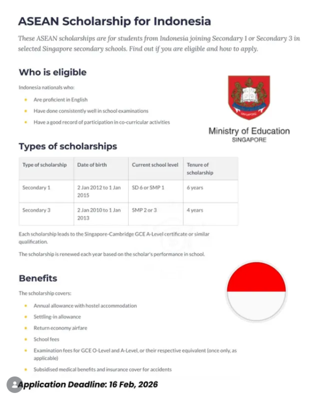 Возможность, которая изменит жизнь выдающихся индонезийских старшеклассников, получить образование мирового уровня в Сингапуре при полной финансовой поддержке. Эта стипендия предназначена для формирования будущих лидеров АСЕАН и раннего открытия глобальных перспектив.