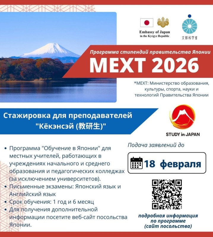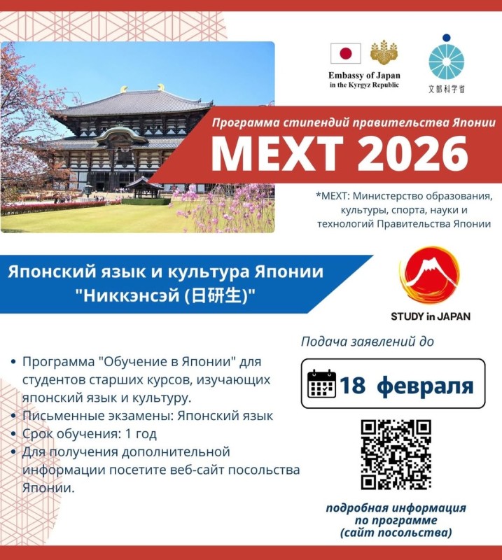 Япониянын Элчилиги Япониянын Билим берүү, маданият, спорт, илим жана технология министрлигинин (MEXT) Никкенсэй жана Кёкенсэй өкмөттүк стипендиялык 2026-жылдык программаларына арыздарды кабыл алууда.