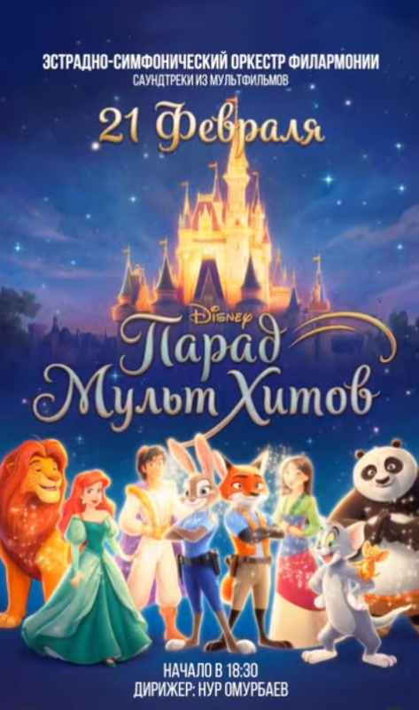 Дорогие друзья! Эстрадно-симфонический оркестр Кыргызстана под руководством Нура Омурбаева приглашает на «Парад мультхитов»