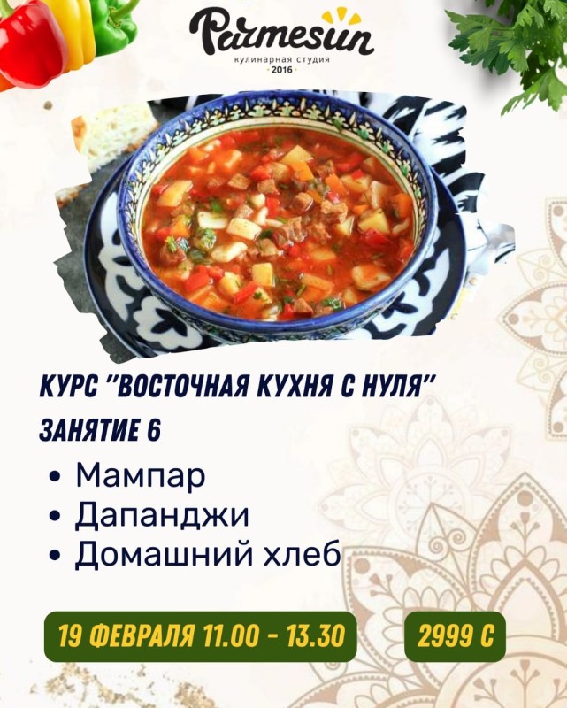 Четвертое занятие курса (учимся готовить суп чучвара, бешбармак, самсы слоенные) «Восточная кухня с нуля» от Parmesun