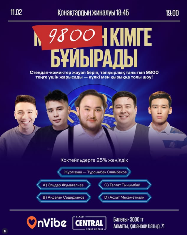 Стендап-комики попытаются выиграть 9800 тенге, отвечая на вопросы или демонстрируя остроумие. Это смешное и познавательное шоу – мечта для тех, кто его уже видел, и для тех, кто еще не видел!